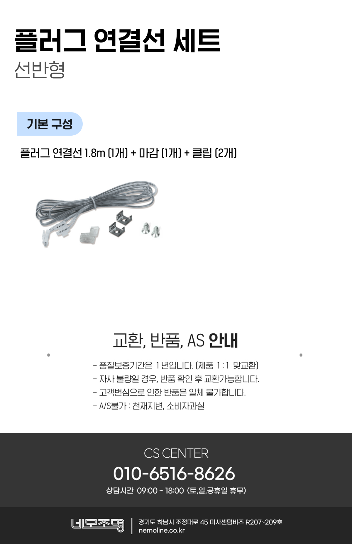 플러그 연결선 1.8m (1개) + 마감 (1개) + 클립 (2개)
